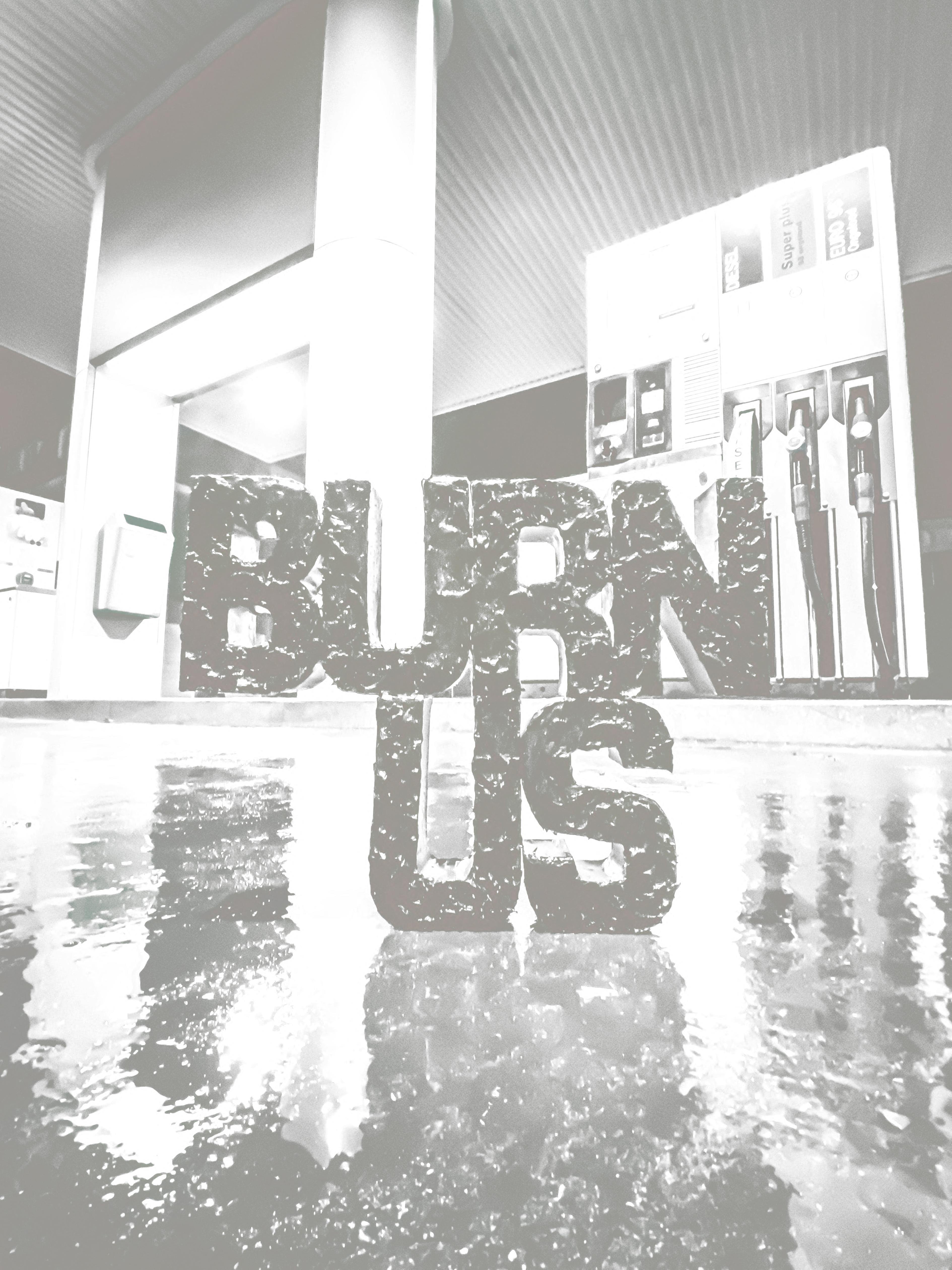 Project BURN US was inspired by the fossil fuels problem that we as a society face in these times. With this project I want to confront people with their own actions, and force people to think about their own part in this ecological disaster we all, as humanity, face. I believe that everybody has a contribution in this tragedy, and we all share the burden of trying to save this planet and the lives it provides for. I wanted to create a tar-like appearance on the text. I created this effect by covering the letters in thick glue and painting them black when the glue was dried. The letters were then placed in front of a gas station.