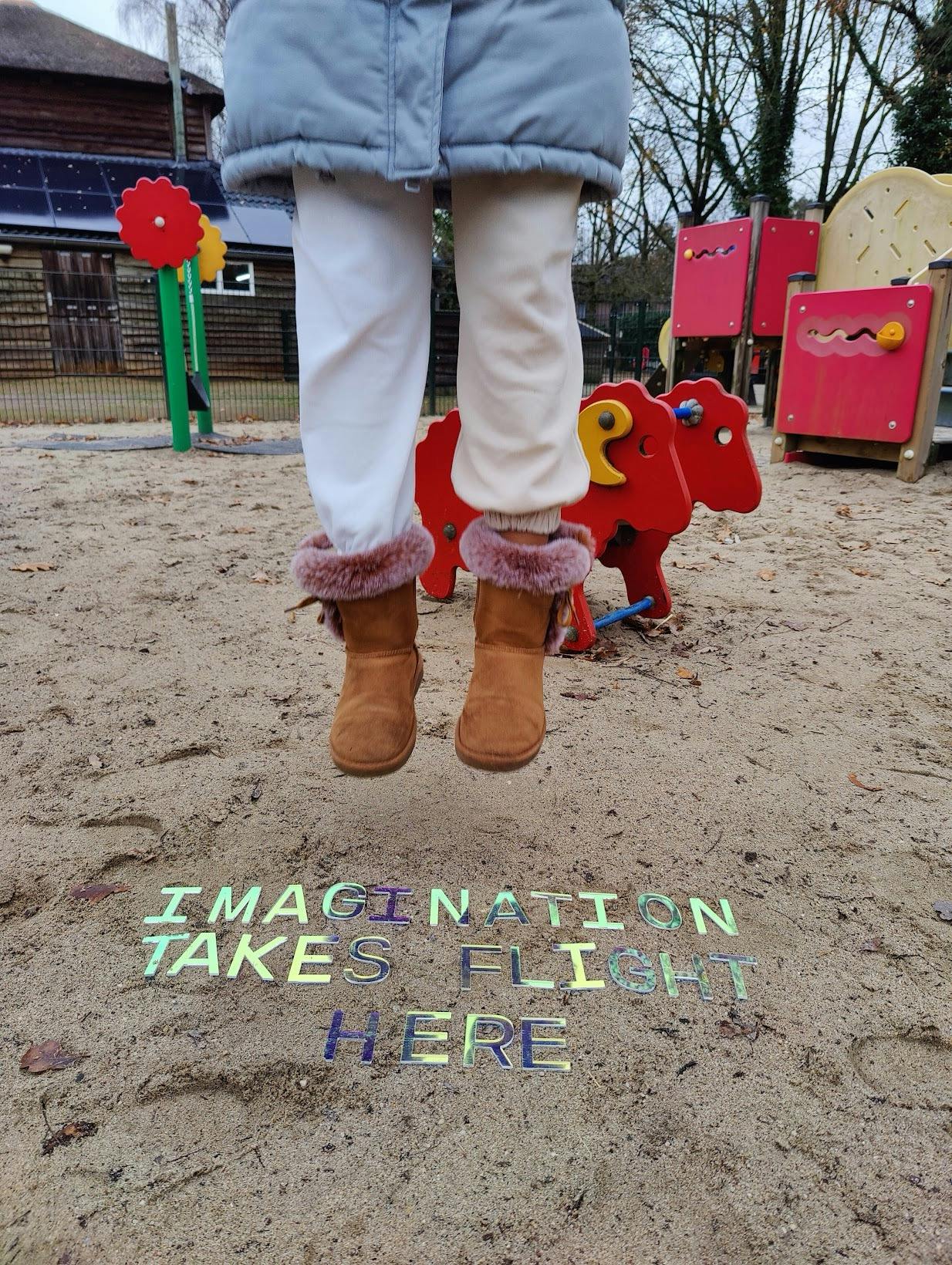 The objective of this project is to create and implement a visually appealing typography design with the phrase "Imagination Takes Flight Here flight here" for placement in a Kinderboerderij in De Maten neighborhood. The typography will be integrated into the environment, complementing the recreational and educational atmosphere of the space.