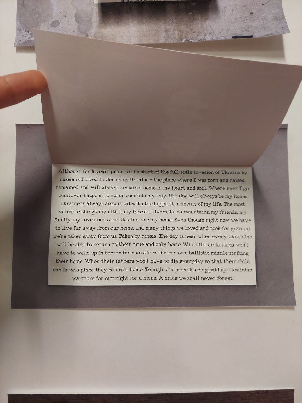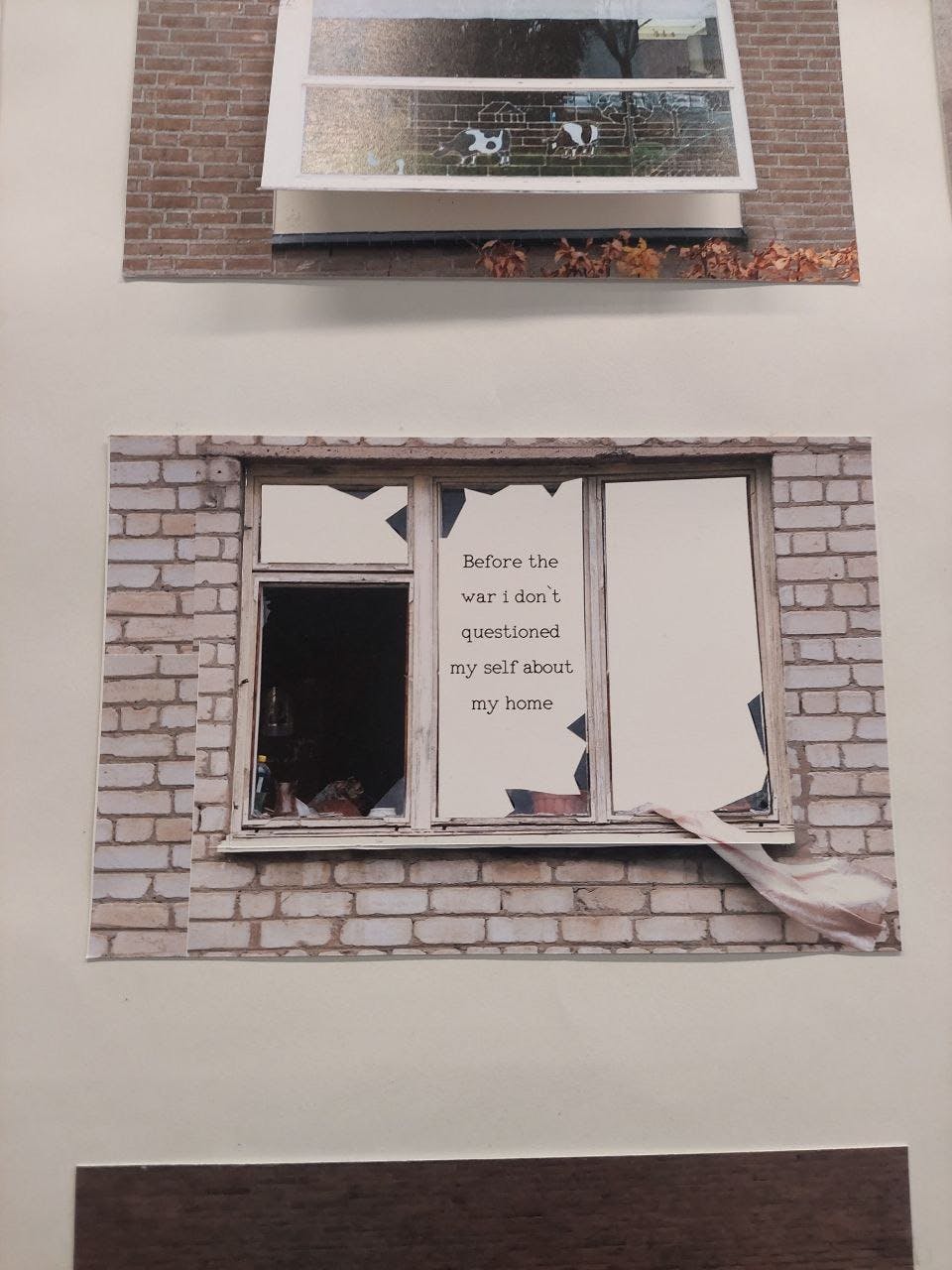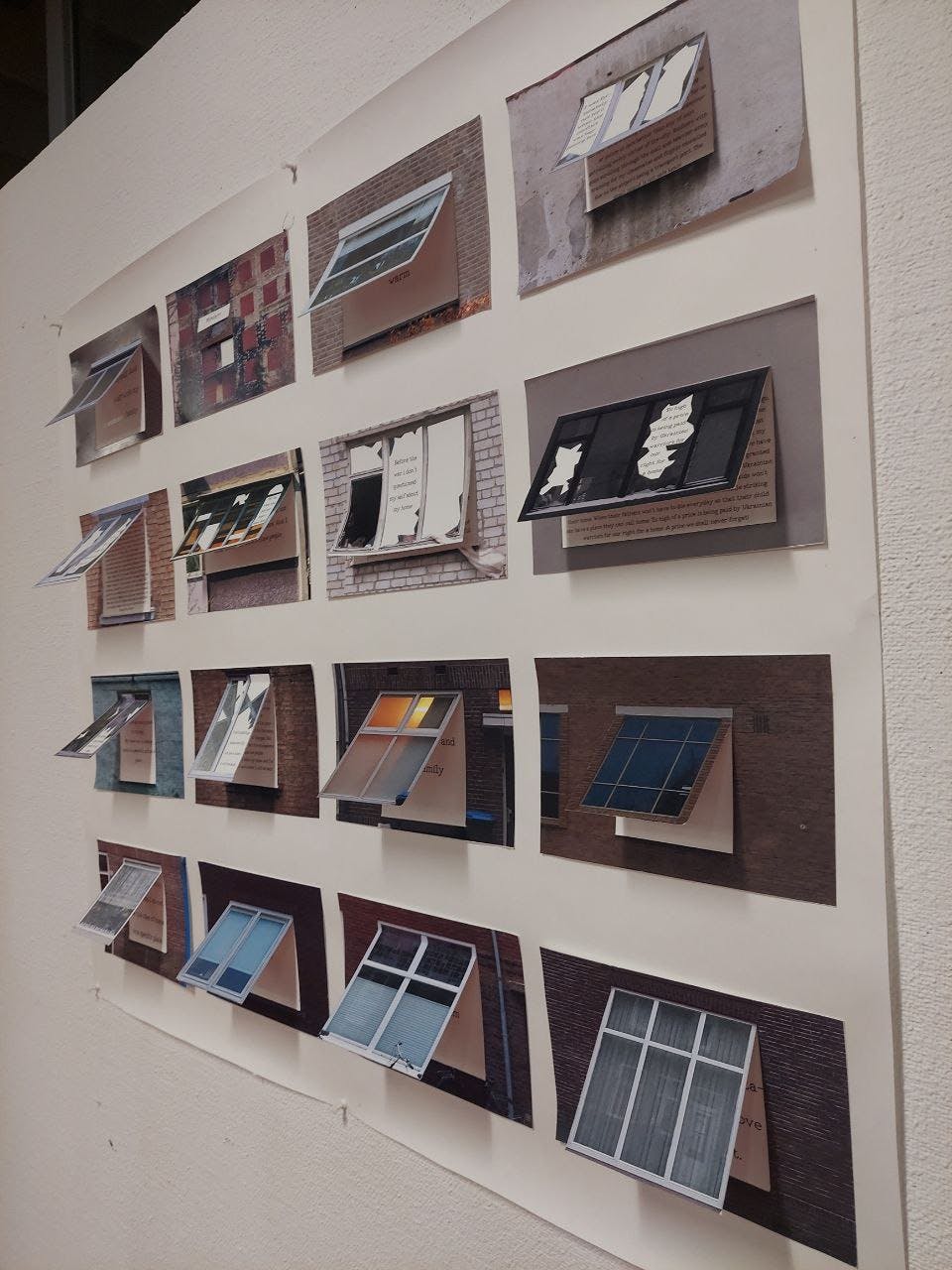 A poster with photos of windows from peaceful Eindhoven (a city in the Netherlands) and Kyiv (a city in Ukraine where russia is currently engaged in a full-scale invasion). Each window contains a story and an answer to the question "What is your home?" from people who have experienced war, military action, occupation, terrorist rule, etc. (from different parts of the world) and from people who have never had such an experience. This work shows the contrast between people and their lives, shows different perceptions of their own territory.